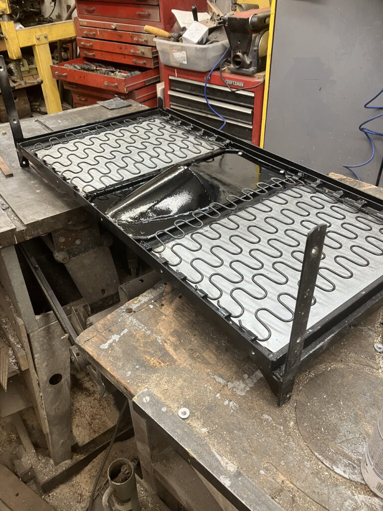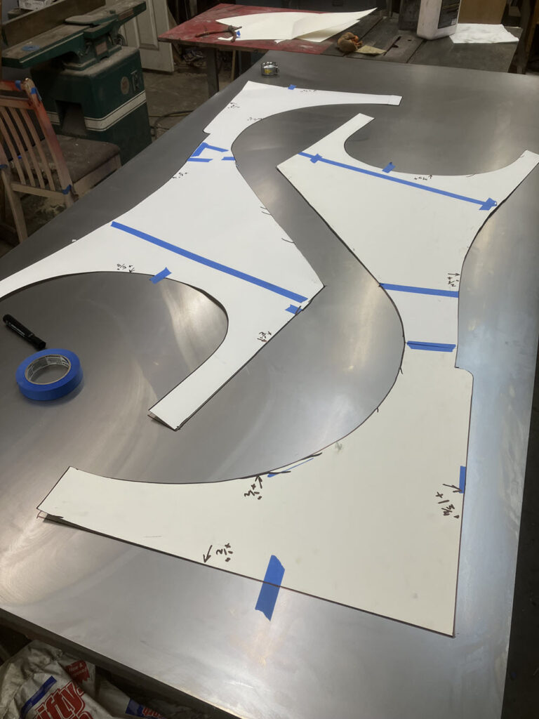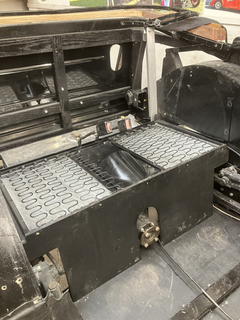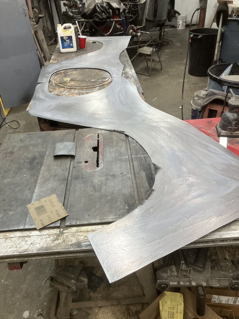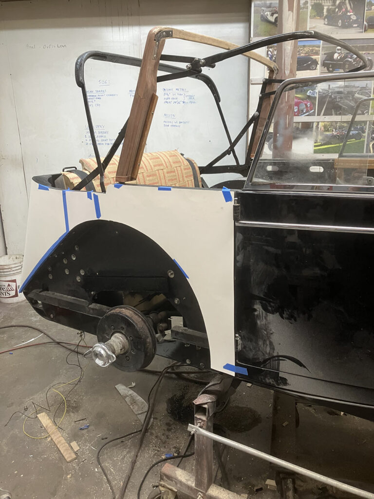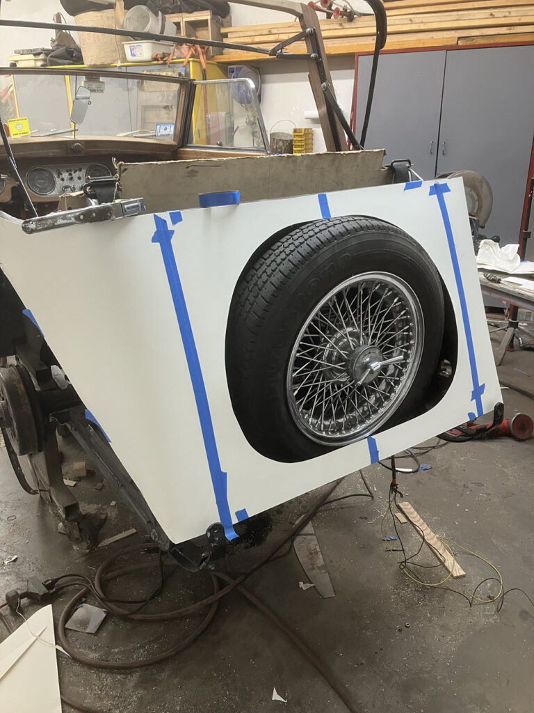 The factory four seat DHCs had an enclosure over the spare. One reason for that was probably the challenge of making a single piece of sheet metal from the wire opening around the spare, wrapped around the wheel arch and hemmed into the recess at the door jamb. It is about 6′ with fussy fits at both ends. So why not make an already difficult job really HARD? l chose to join the left and right panels, add the wire form opening for the spare and hang the 12′ panel in one shot. Hmmmm……… good luck.