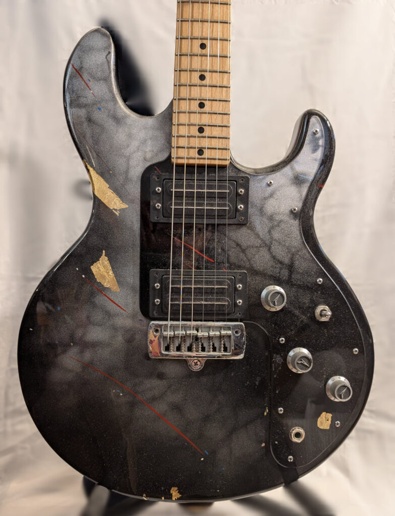 This section began with the Red (er… Black) table. I had the black paint treatment with the gold leaf and misting in mind for a while but was hesitant to do a table size project. Ian is a friend and neighbor. He plays a pretty mean guitar. One of his instruments was “uncomfortable”. I reshaped the guitar body for him and gave it the black/mist/gold paint treatment. He is still talking to me so I guess it was OK.